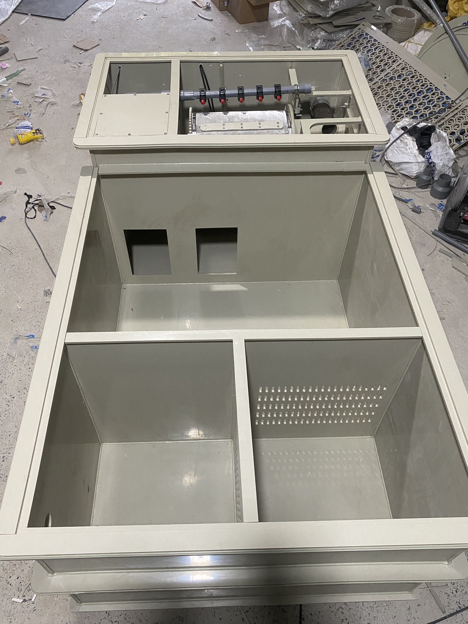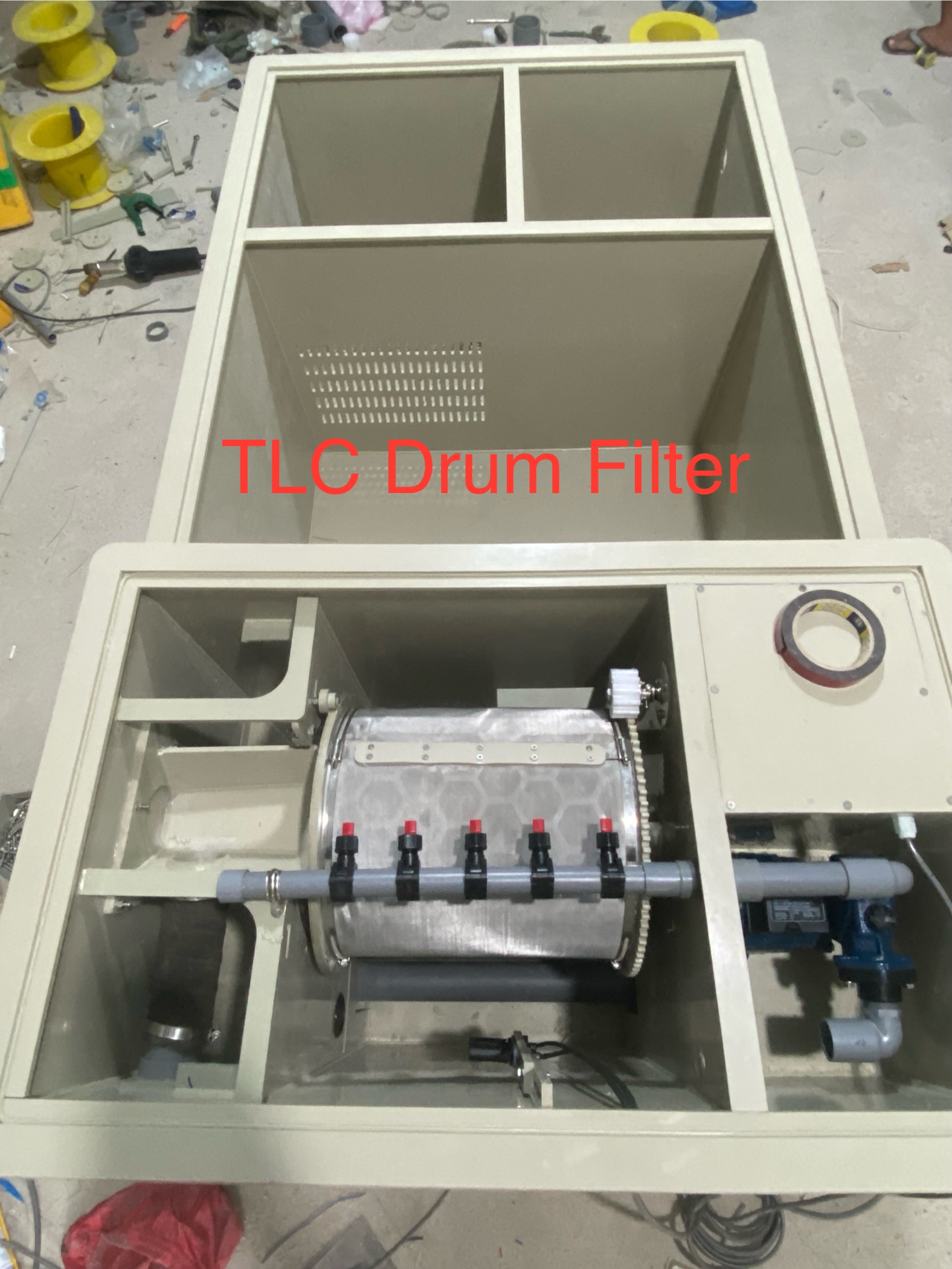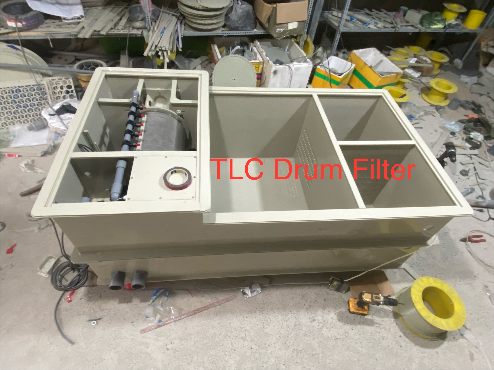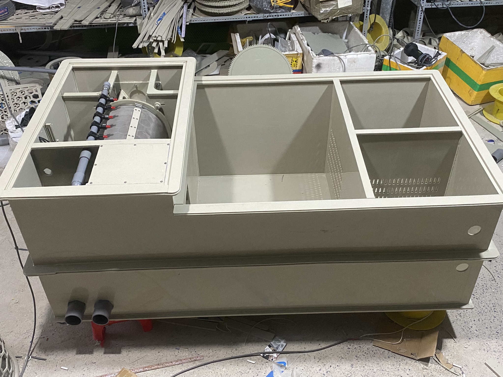 Đây là một bộ lọc trống 3 ngăn chuyên dùng cho hồ cá koi hoặc các hệ thống nuôi trồng thủy sản tuần hoàn.