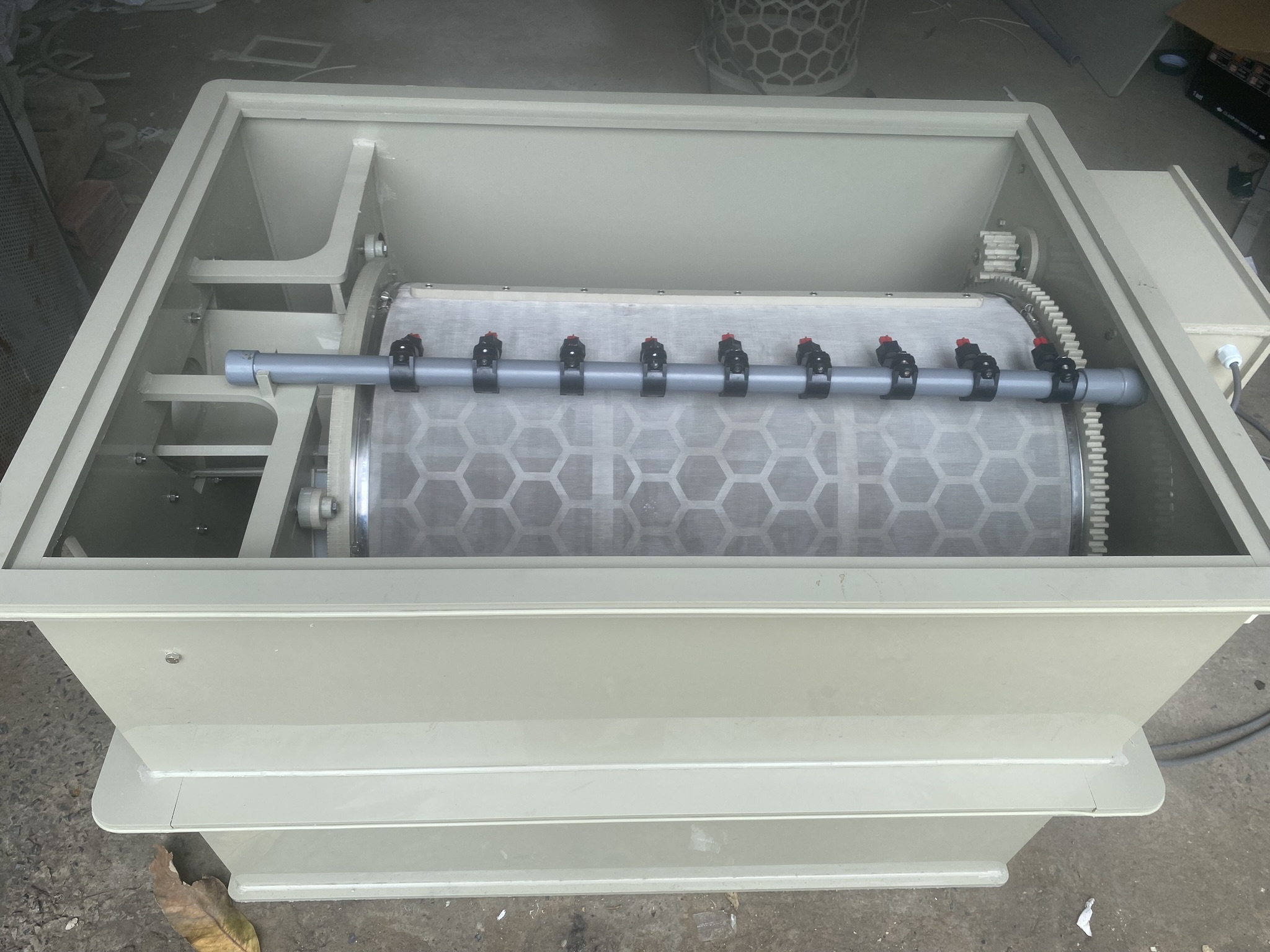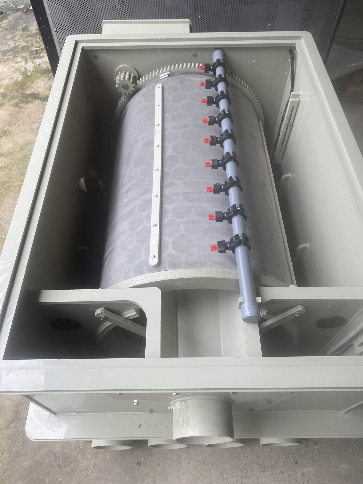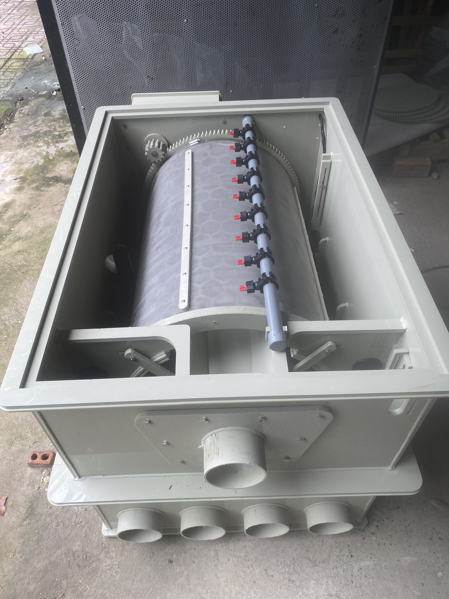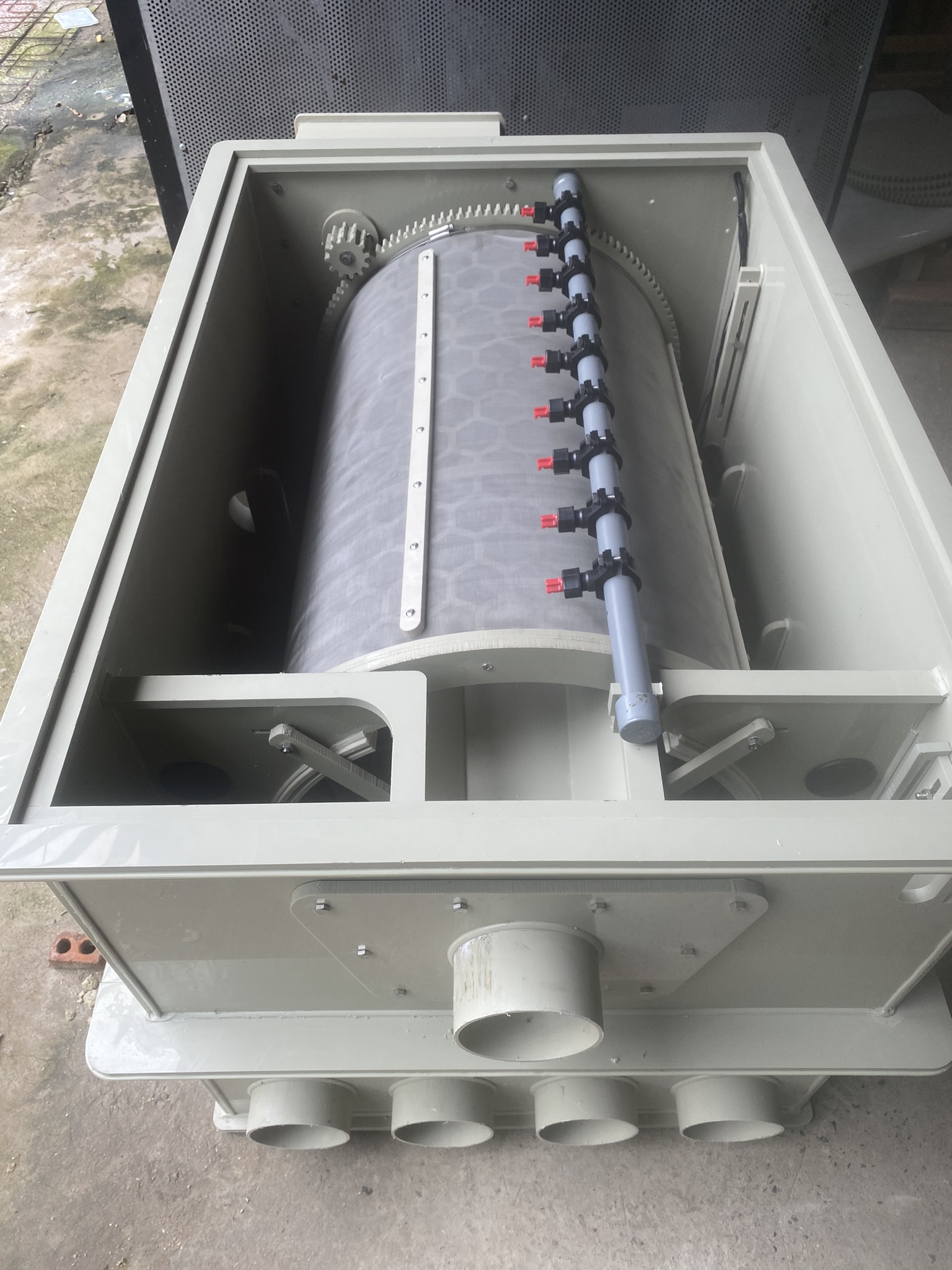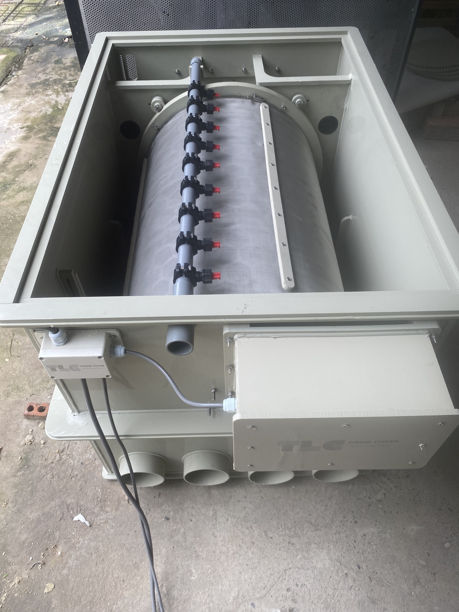 Drum Filter bộ lọc trống (Rotary Drum Filter – RDF) là thiết bị được lắp đặt trong ngăn lắng của hồ Cá Koi, thay thế cho chổi lọc. Drum Filter tự động đưa cặn bẩn, chất thải cá Koi ra khỏi hồ gần như tức thời qua lưới lọc rất mịn chuẩn 80 micromet mà hạt cát khó lọt qua được.